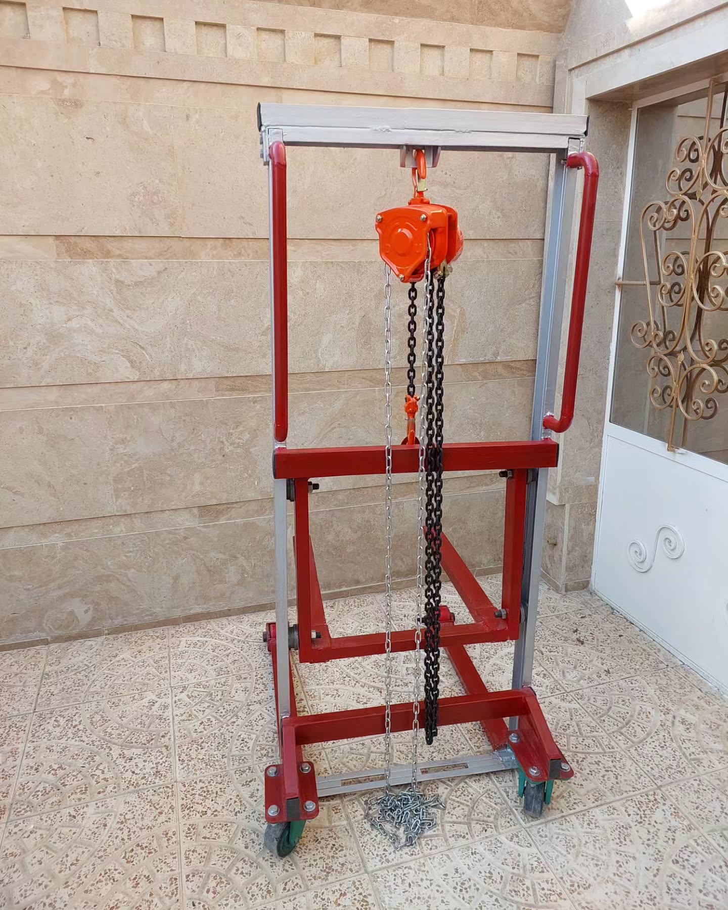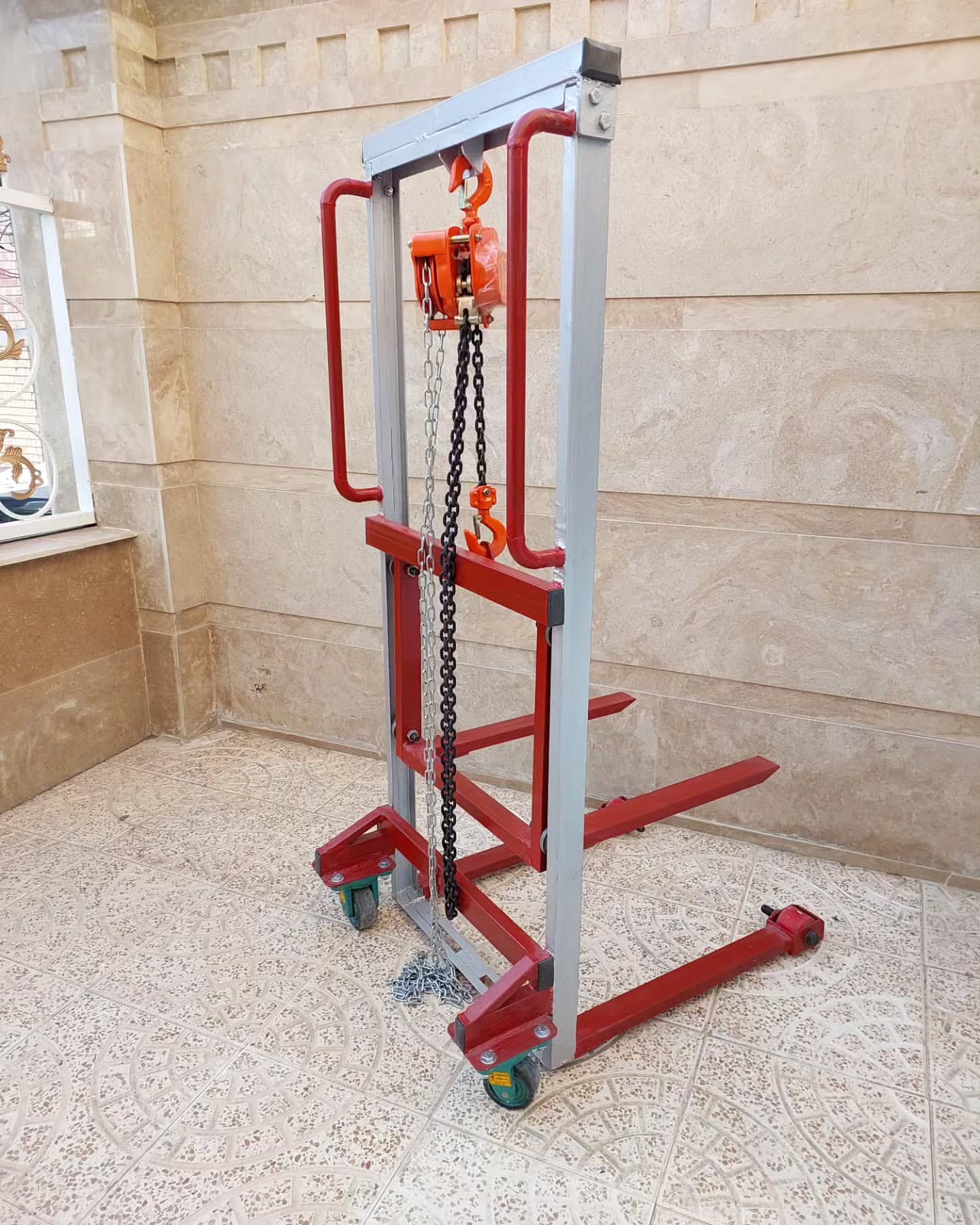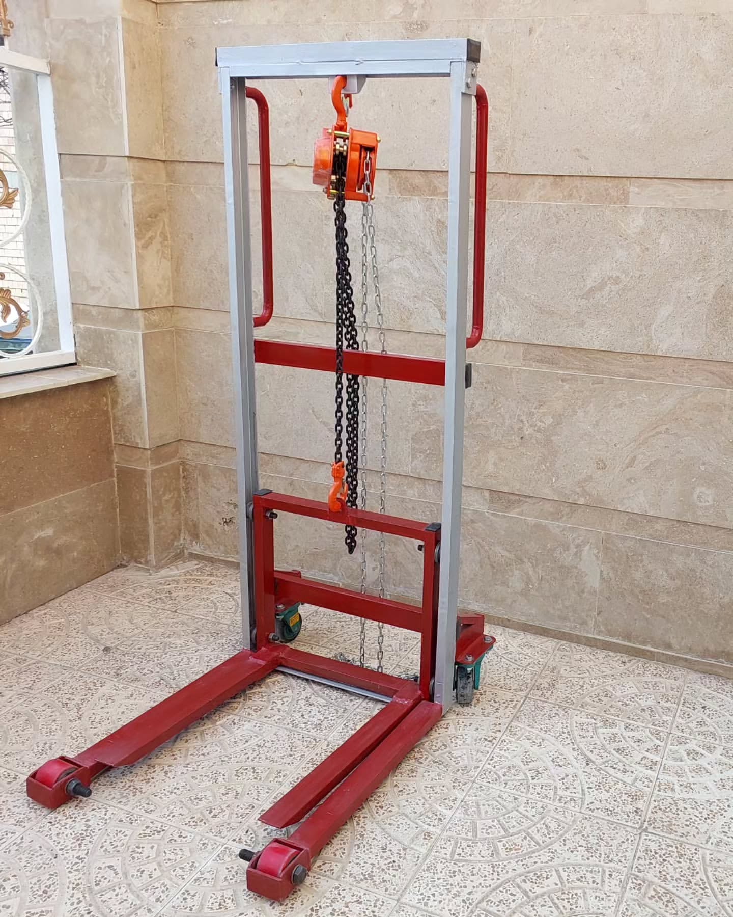 لیفتراک دستی با جرثقیل سقفی زنجیره ای ظرفیت کشش بار متوسط ۵۰۰ کیلوگرم حداکثر ارتفاع : ۱۶۰ سانتی متر عرض شاخک ها : ۵۰ سانتی متر طول شاخک ها : ۶۴ سانتی متر ظرفیت تحمل بار چرخها : شاسی : ناودانی نمره ۶ سنگین محل های قابل استفاده : مناسب برای انبارهای کاشی و سرامیک انبارهای پارکت فروشگاههای لوازم خانگی جهت جابجایی یخچال . لباسشویی. ظرفشویی و .. دستی سقفی دستی زنجیره ای